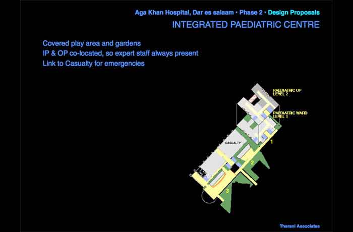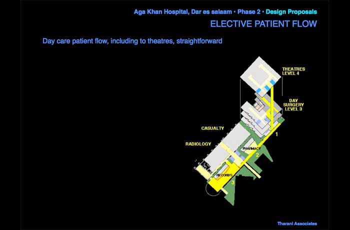 The Masterplan envisaged expansion for the next 20 years. This study for the addition of around 6,000 m2 to the existing Aga Khan Hospital, Dar es salaam in 2003 was carried out closely with the hospital administration and staff.