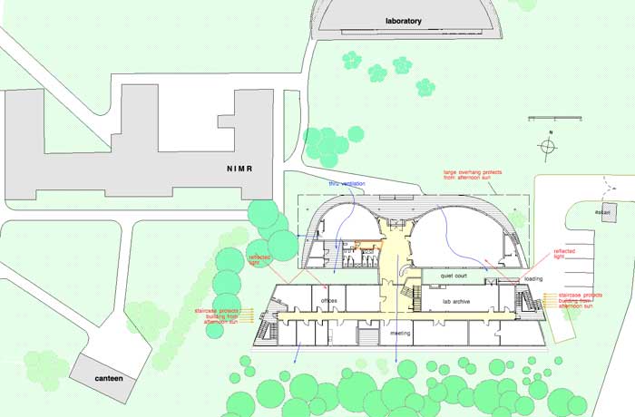 The existing trees to the west and the south formed the soft boundary for the building, allowed pleasant views, and formed a village like setting - an ideal desired by the client, and suited to this building programme of offices, research and training facilities, especially when the proposed extension to the laboratory is built.