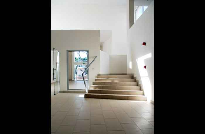 The building is aligned east-west to minimise solar gain; stairs protect the severely exposed east and west faces.