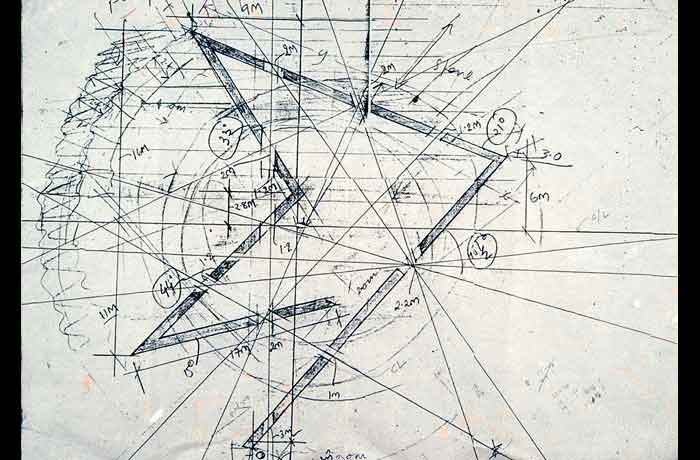 Structure for a 40m diameter roundabout premised on the act of moving. Through views were possible when the slots coincided as one moved round.