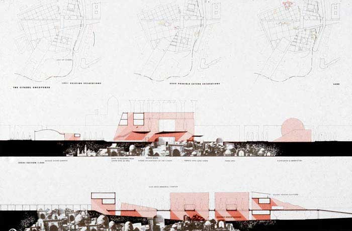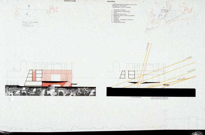 Competition entry for a 25.5 hectare site in the centre of Samarkand to house public facilities such as a library, a museum, art galleries, open air theatre, cinemas, hotels, exhibition spaces and pavilions, gardens, and an observatory.